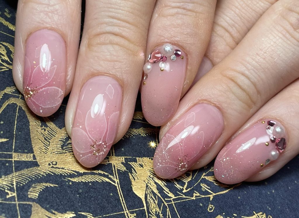 ふんわりしたピンクに、繊細なたらしこみフラワーで
