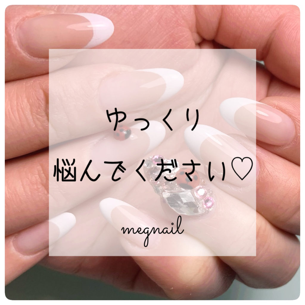 こんにちは(*^▽^*)名古屋市東区高岳自爪育成サロンmegnail鈴木です★皆様、デザイン選びに迷ったことはありませんか?また、時間制限のあるサロンで急かされる気持ちになったことはありませんか?同じ